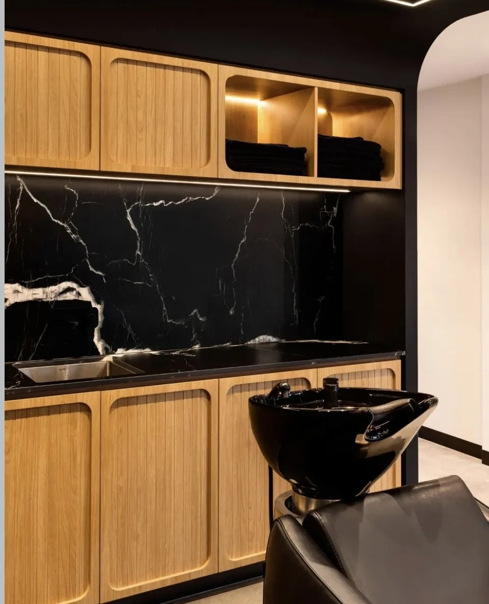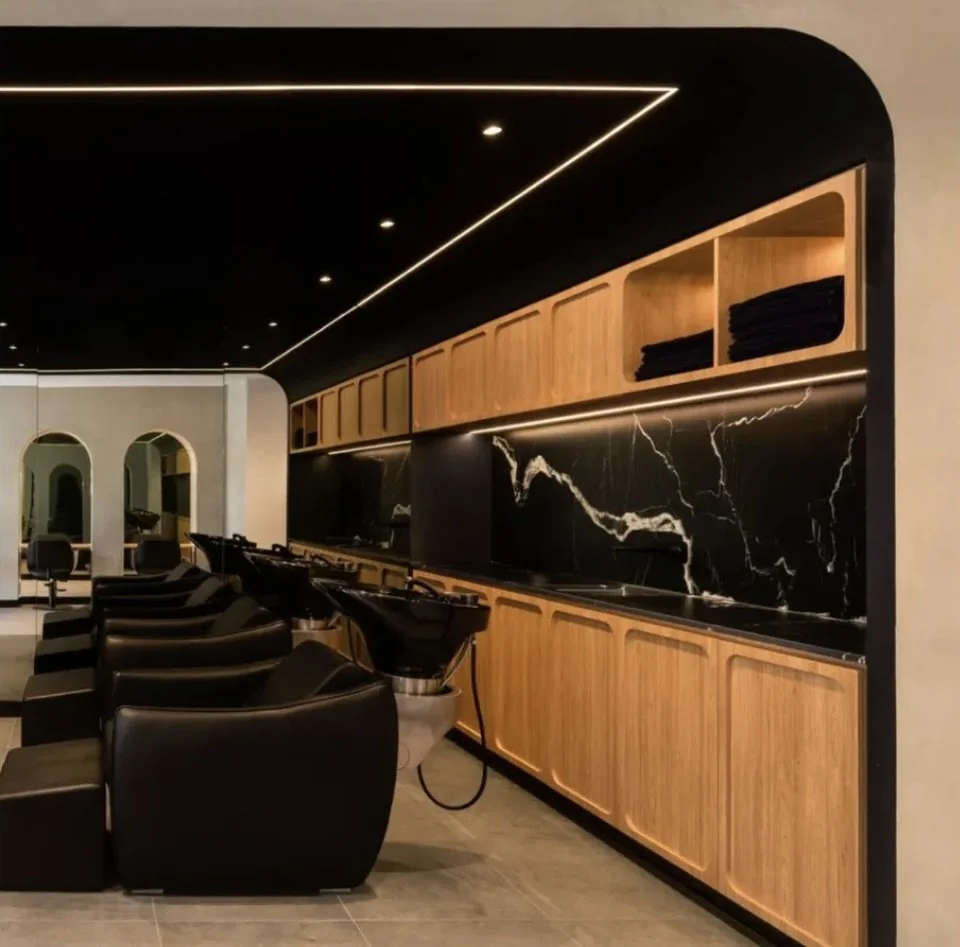 From the moment you enter, you’re met with a soft rhythm of flowing lines, from curved walls and rounded mirrors to sculptural furniture pieces that guide the eye gently through the space. These organic shapes aren’t just aesthetic; they evoke a sense of ease and elegance, mirroring the fluidity of hair in motion and the artistry of the stylists at work.